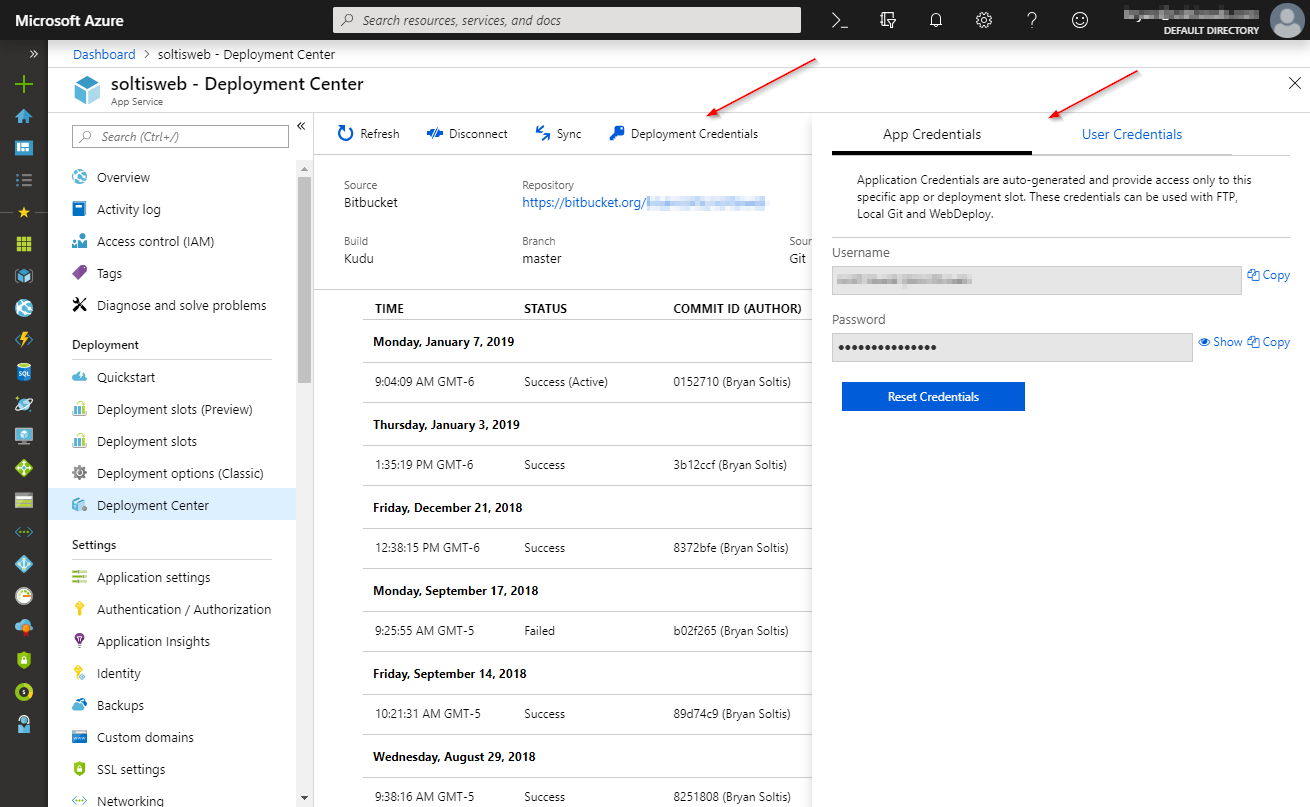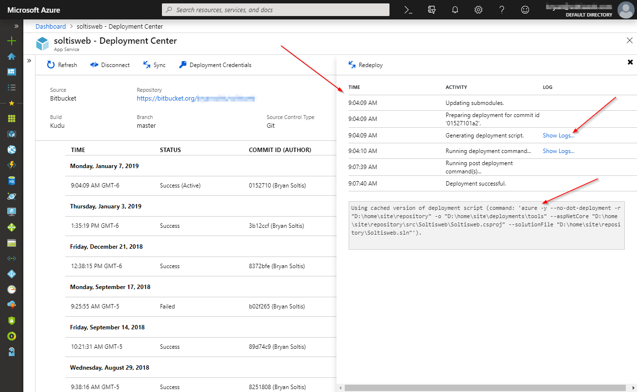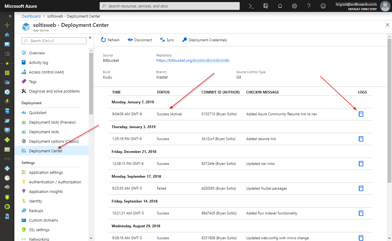 This module wasn’t necessarily bad. It provided plenty of details about the integration (the service the repository is at, a list of past deployments, and some administrative functions to manage the connection) and how things were running. Detailed logs could be loaded to see each command that was executed and the result. But, as with most 1st edition of tools, it could stand some polishing after the initial release. As more developers used the feature, Microsoft collected feedback on the things they got right, and the areas that could be improved. Enter the Deployment Center utility.