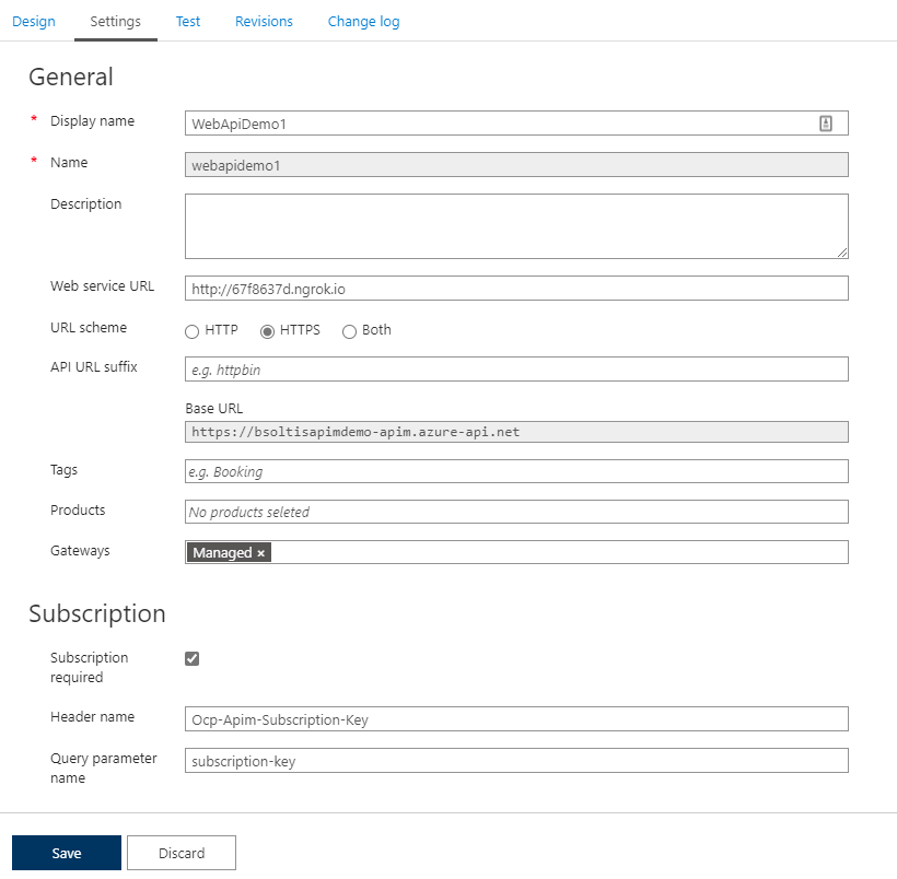 Note that I have my 67f8637d.ngrok.io URL as the Web Service URL, as well as the Subscription required option selected. This will prevent unwanted calls to my APIM.
