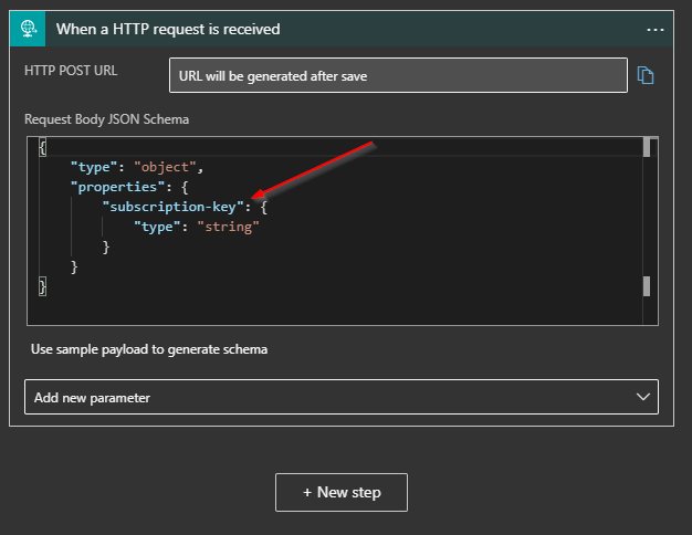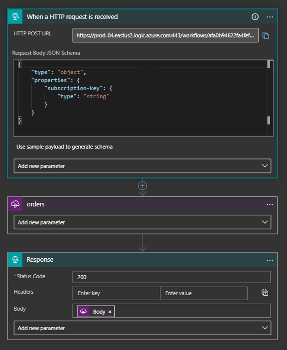 With the API and APIM running, I’m ready to create my Logic App. I start with a simple Http Request trigger. I will be passing my APIM subscription key in the body to the Logic App, so I add the schema to the configuration.