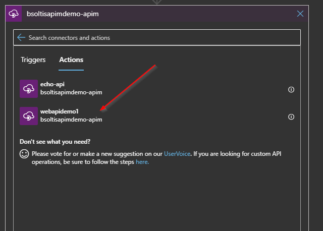 Next, I add a step to access my APIM. This is one of the built-in connectors and makes selecting your API a very simple process. I choose my newly registered API.
