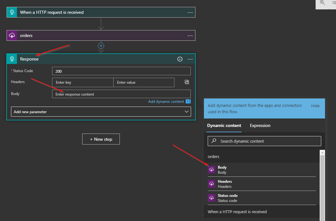 I then add a Response step and select the Body of the APIM step as the return value. This will pass the API response JSON through to the end of the Logic App.