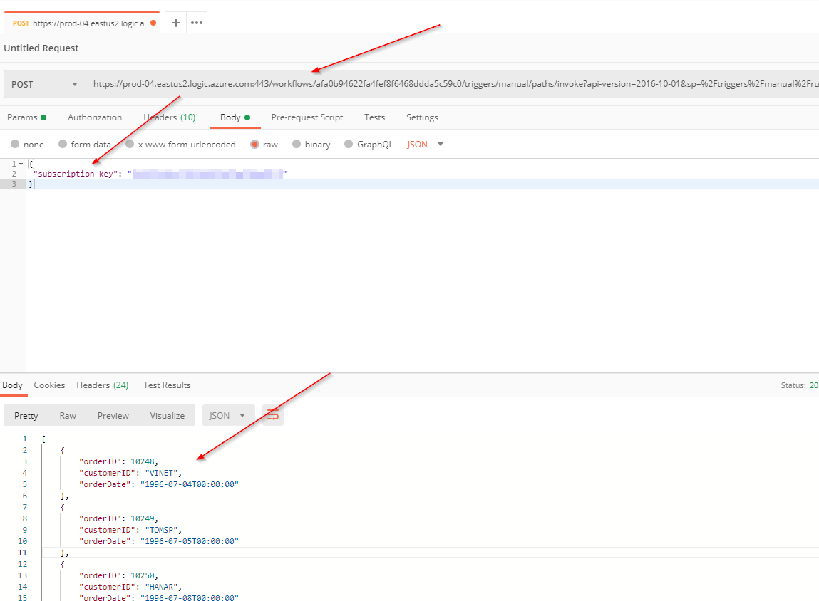 Now, let’s see if this thing works. To test the process, I use Postman to call my Logic App, passing my subscription key in the body. I make a POST to my Logic App URL, passing the key, and get the list of orders returned.