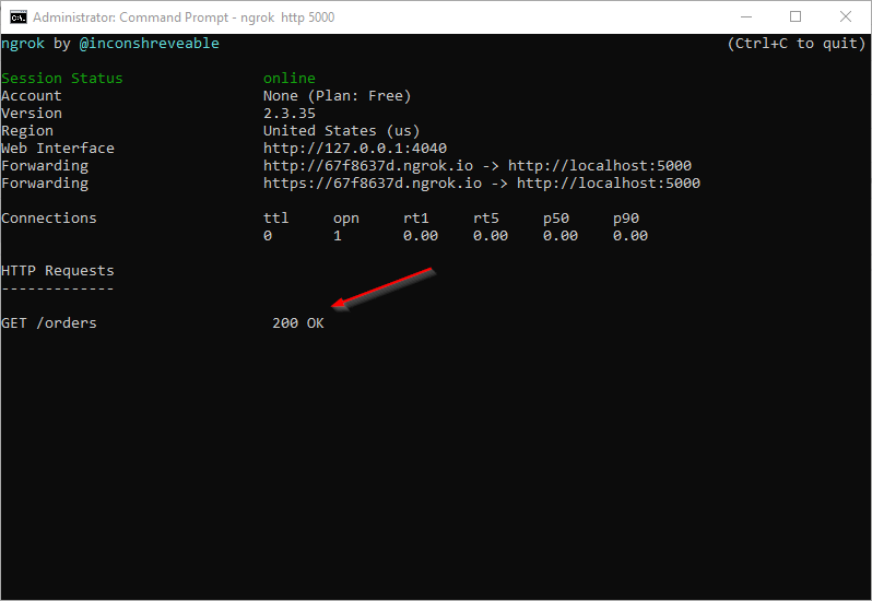 In my ngrok utility, I have a new HTTP Request to the GET /orders method. This proves that the local API was accessed and returned a response.