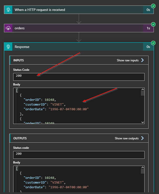 In my Logic App run history, I view the successful execution, including the response that was returned to Postman.