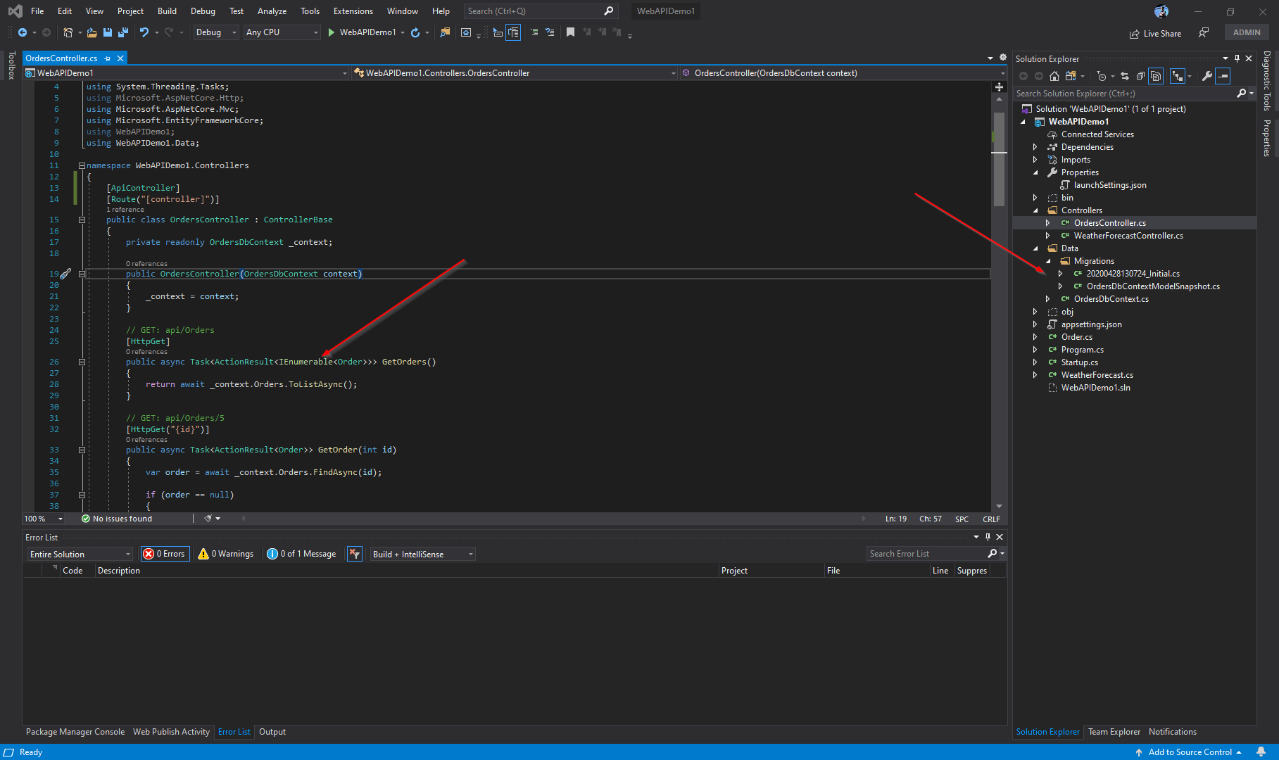Here’s my simple Web API. I’m using EF to connect to a local SQL server to work with order data from the always exciting Northwind DB.
