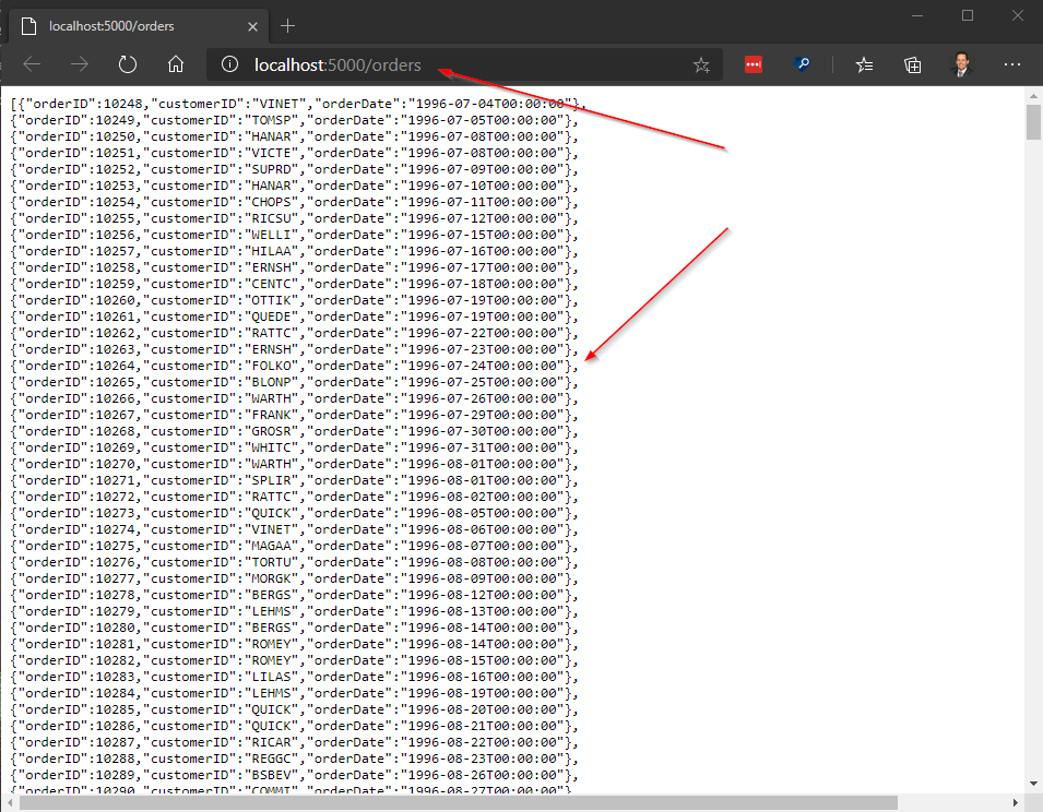 Running the project launches the Web API on http://localhost:5000 and returns all my order data.