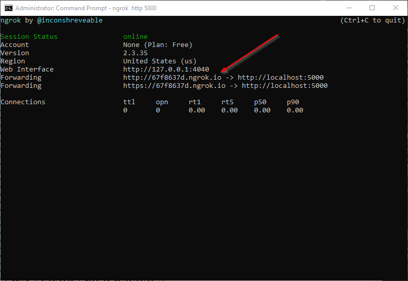 With the Web API running locally, I can fire up ngrok to do its magic. This free tool makes accessing your local services from the internet a simple process. I use it a lot when developing to test connectivity and ensure functionality.