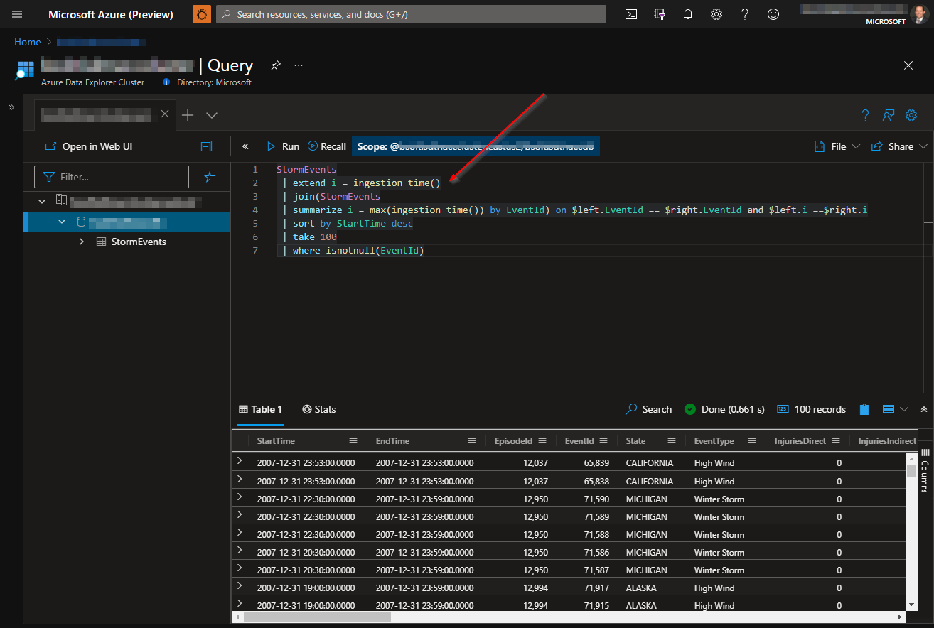 In the UpdateStormEvent, I use the Kusto.Ingest library to insert my new data.