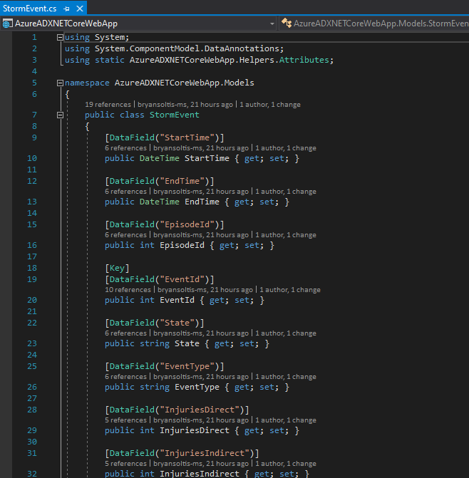 The DataHelper class contains the Kusto SDK code to interact with ADX. To retrieve a list of storm events, I execute the following Kusto.Data code in the GetStormEvents function.