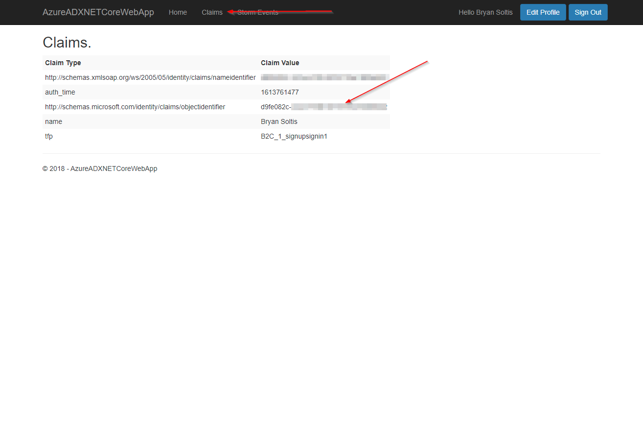 The Azure B2C template includes a Claims view to allow you to see all the claims returned by Azure B2C. This can be very helpful in building a personalized experience for your users. This is also the collection I pulled from for sending the user’s oid to my API.