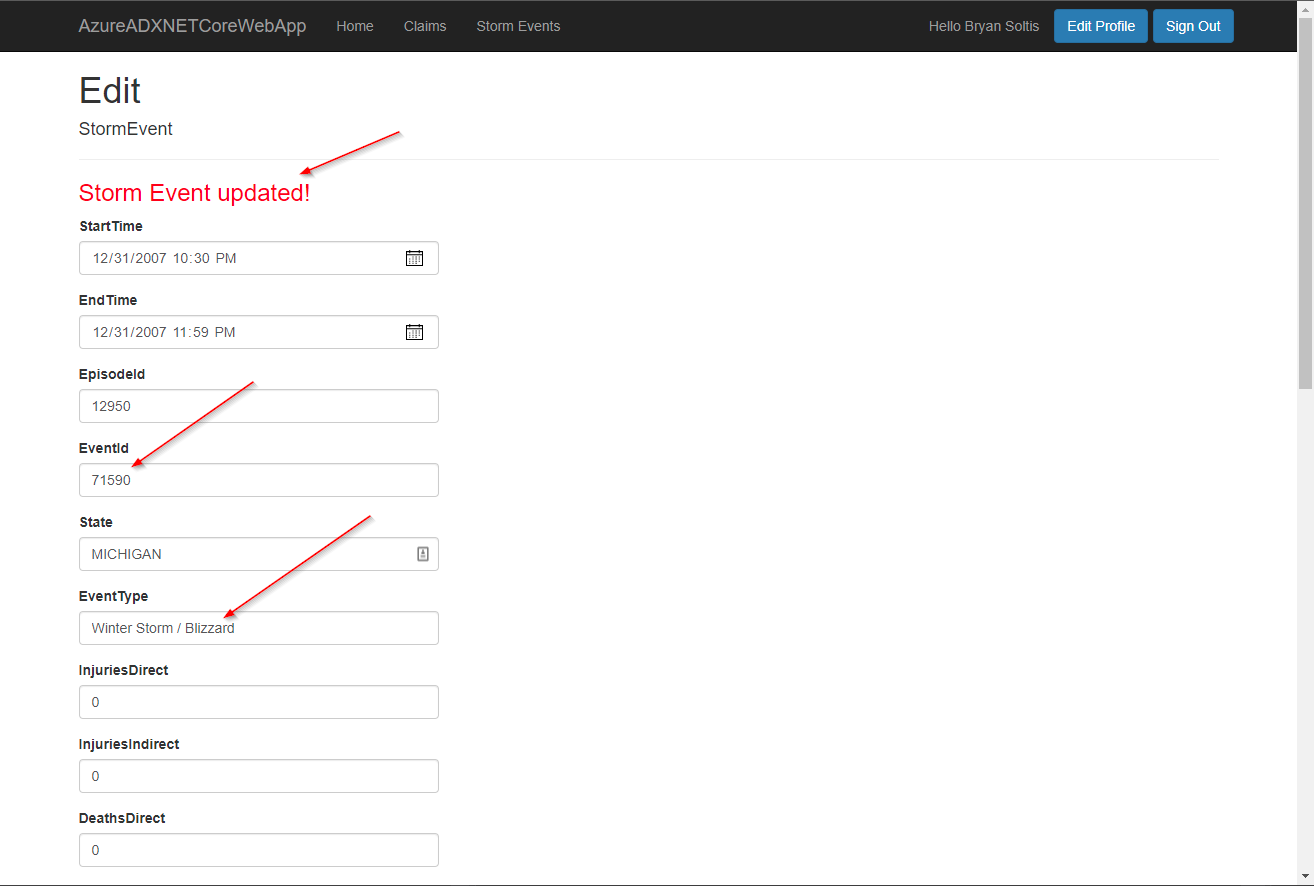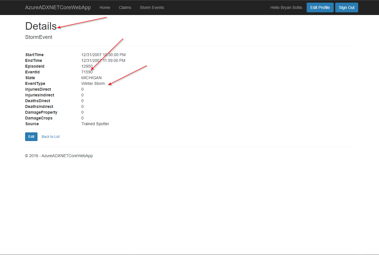 I created Index, Details, and Edit views, along with a StormEventsViewModel and StormEventViewModel classes.