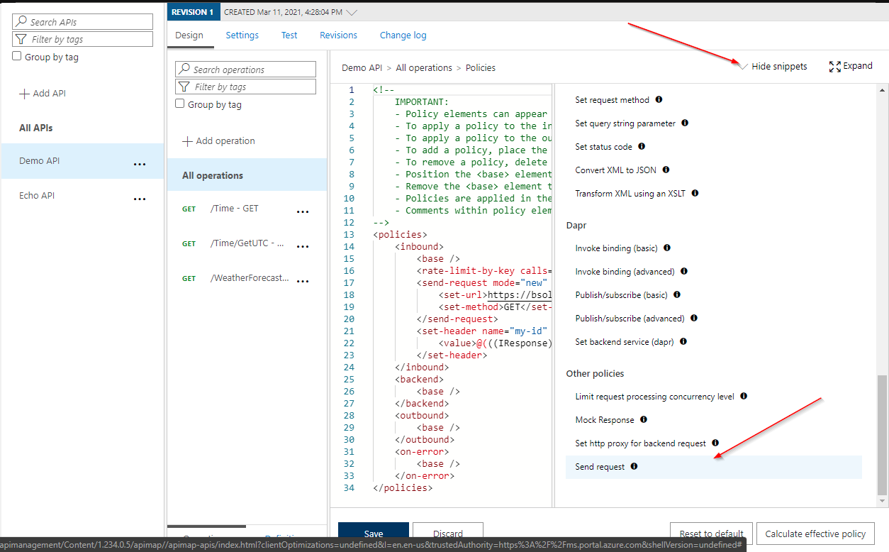 In the policy XML, I selected the Send a request snippet and added the Azure Function app details and set the response-variable-name property to my-id. Additionally, I added a Set header snippet to set the returned value to the my-id header property.