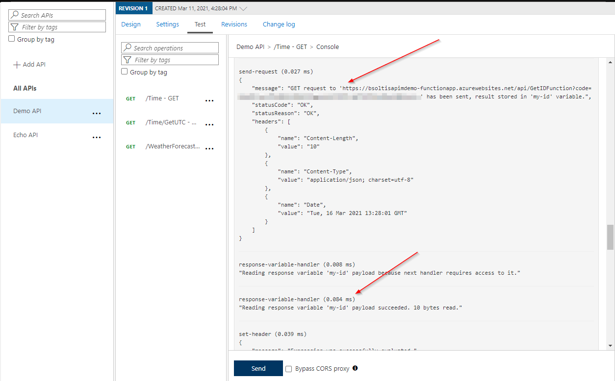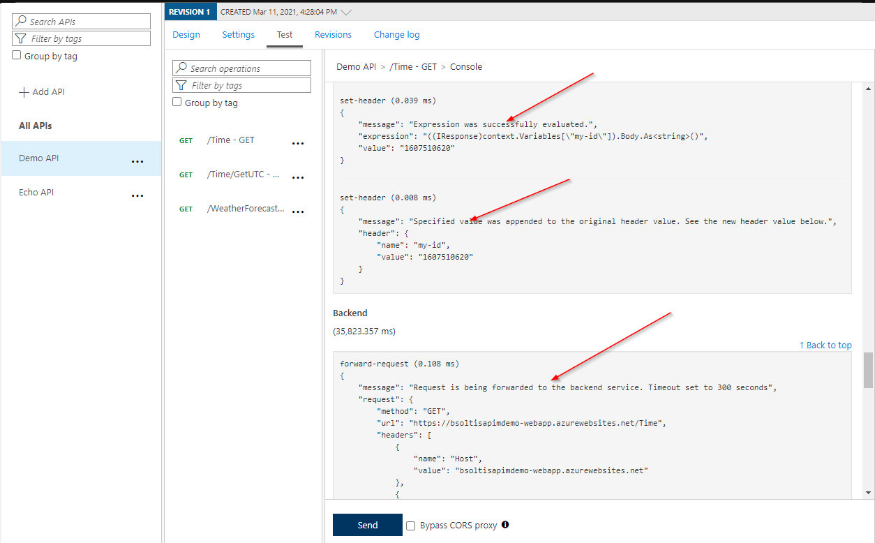 In the Set header policy, I used the context.Variables[“my-id”] identifier to get the returned id. I then set this to a header value of the same name. Once the policy is executed, the Azure APIM request will be sent on to the backend for the API, along with the new header value.