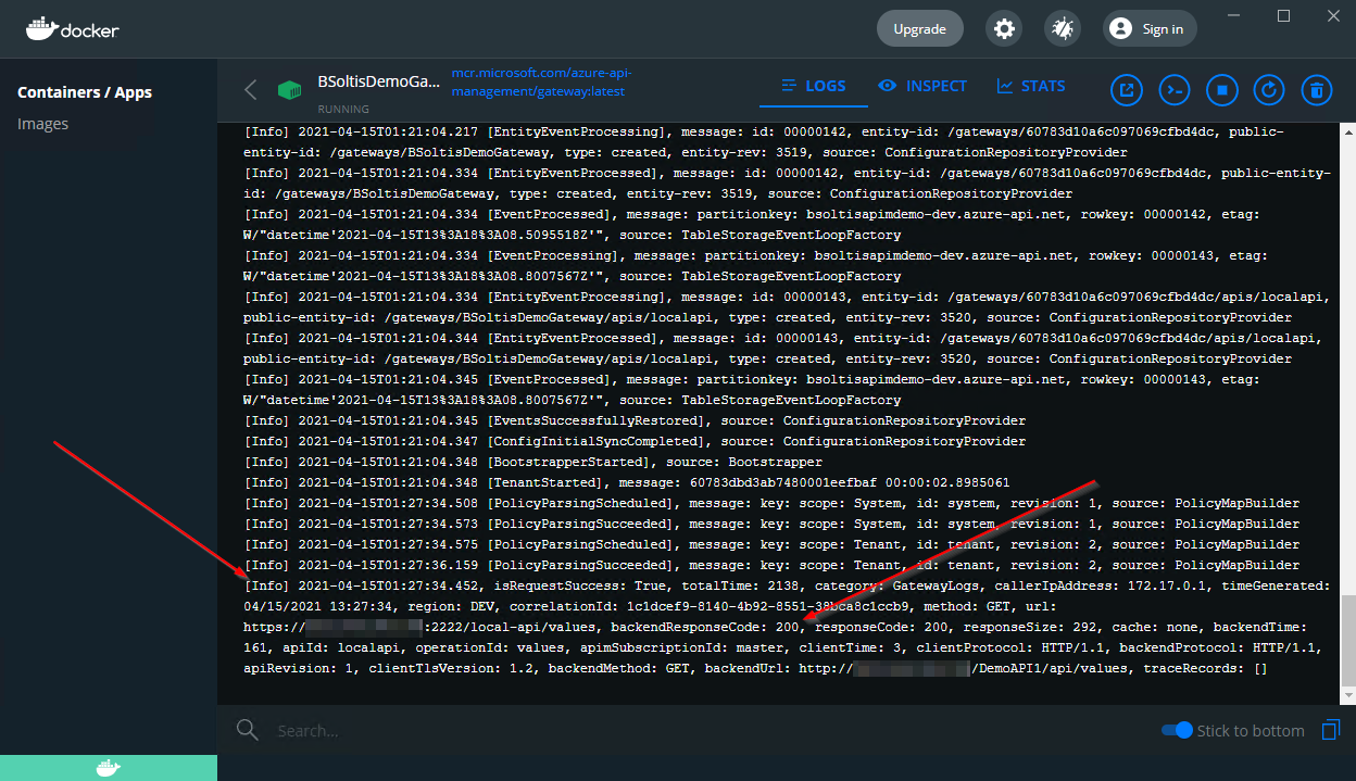 In the Docker Desktop Logs, I confirm the request is logged within the gateway container.