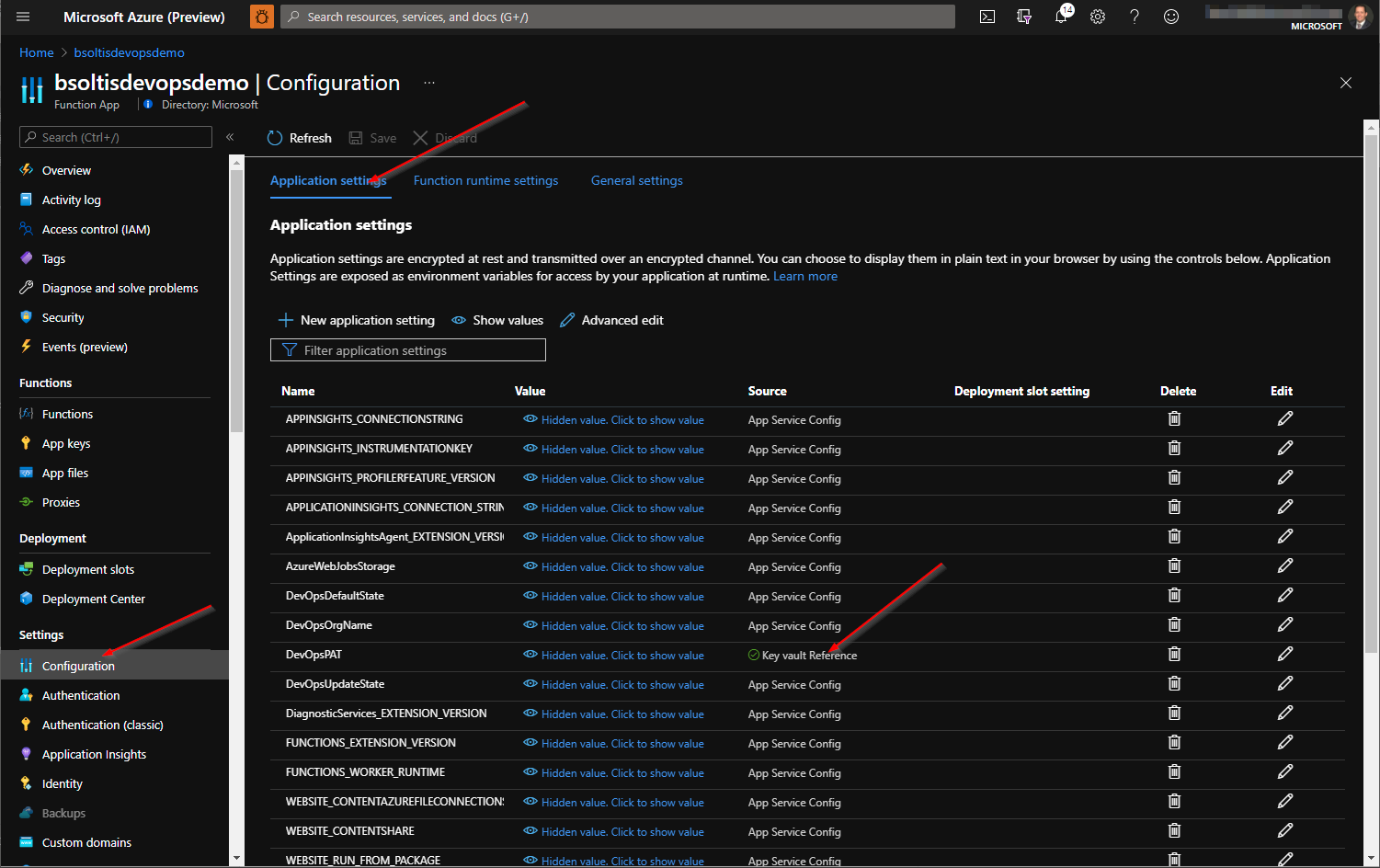 - DevOpsPAT: “[Your Azure Key Vault secret URL in the proper format. Example: @Microsoft.KeyVault(SecretUri=[Your Azure Key Vault Secrete URL])”