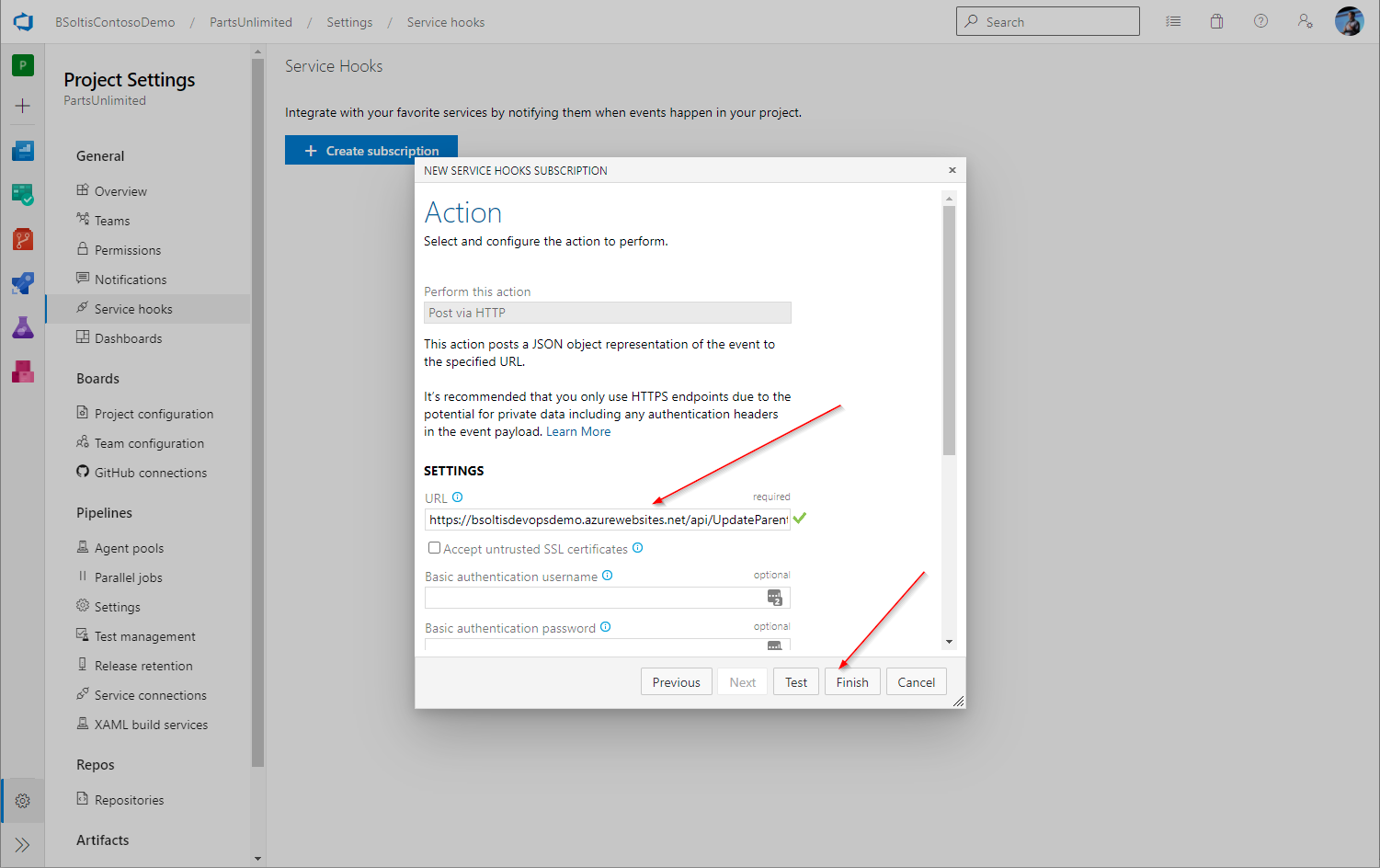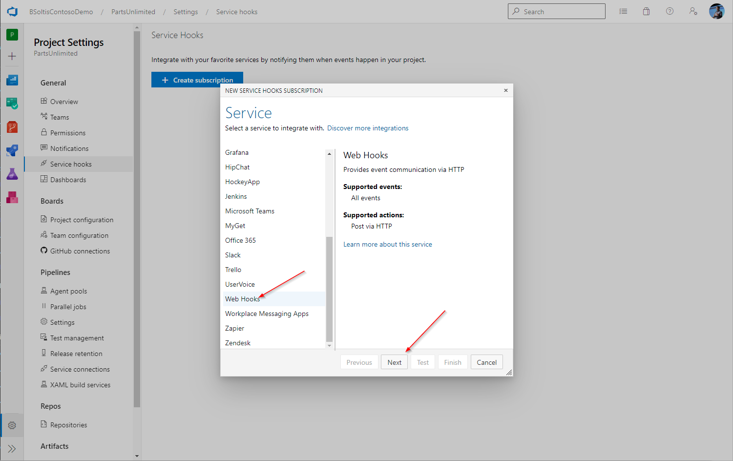 In my Azure DevOps project, I select Project Settings and then Service hooks.
