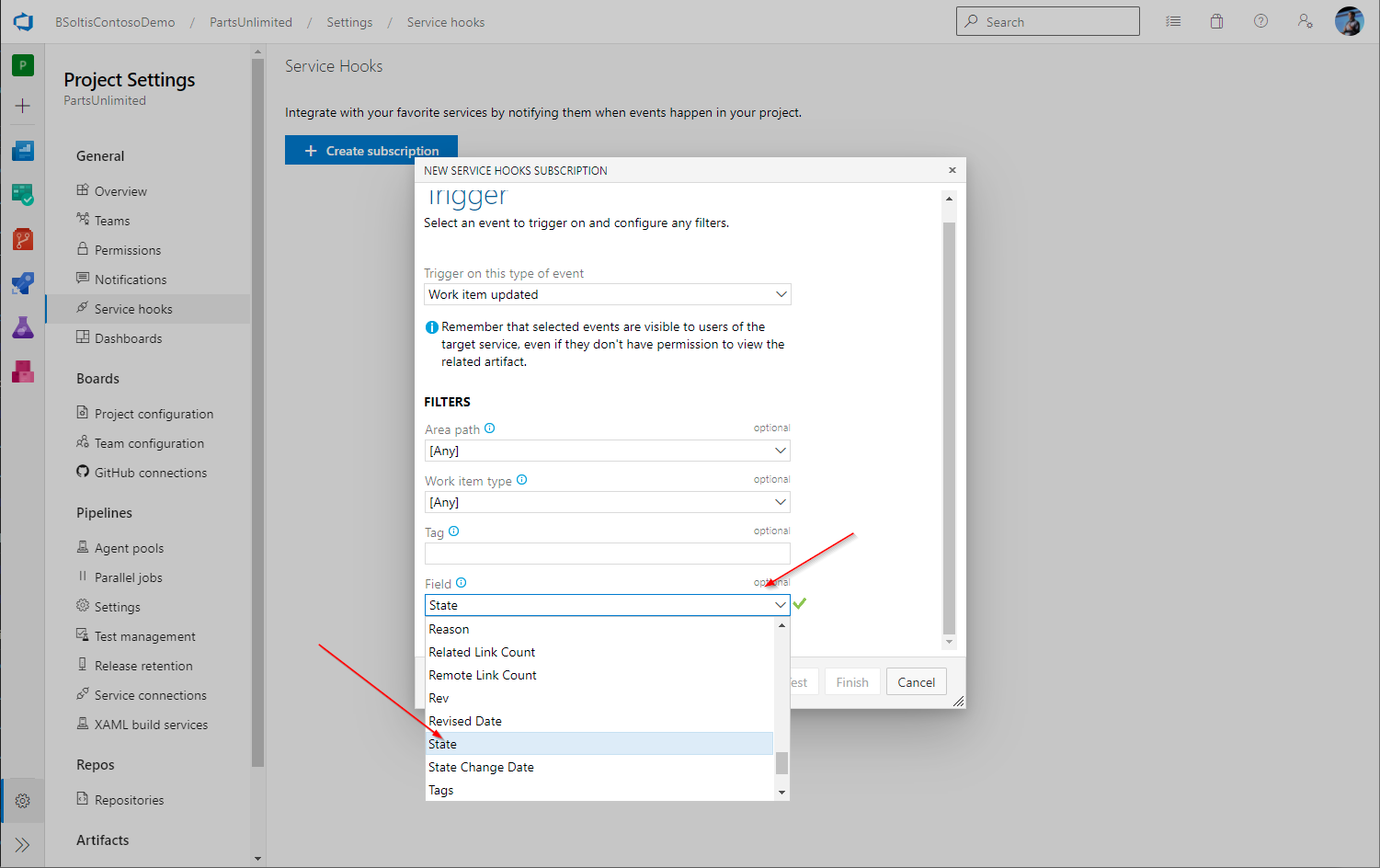 In my example, I need to update the parent work item’s State when a child work item is updated. I select the State field to ensure the service hook is only executed when that field is updated.