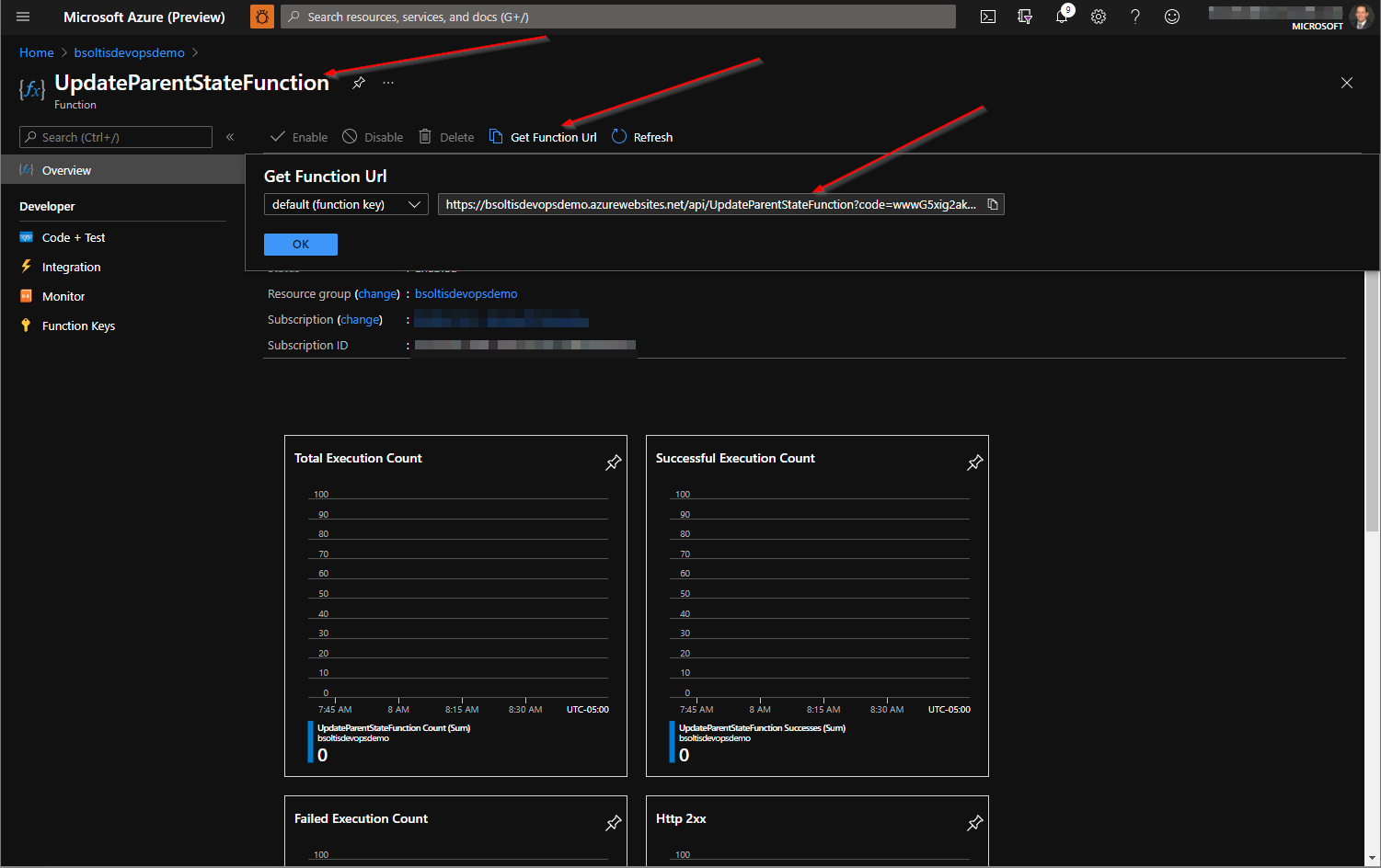Remember the Function URL? I get that value from the Azure Portal (Azure Function>Functions>Overview>Get Function Url) to use for the next step.