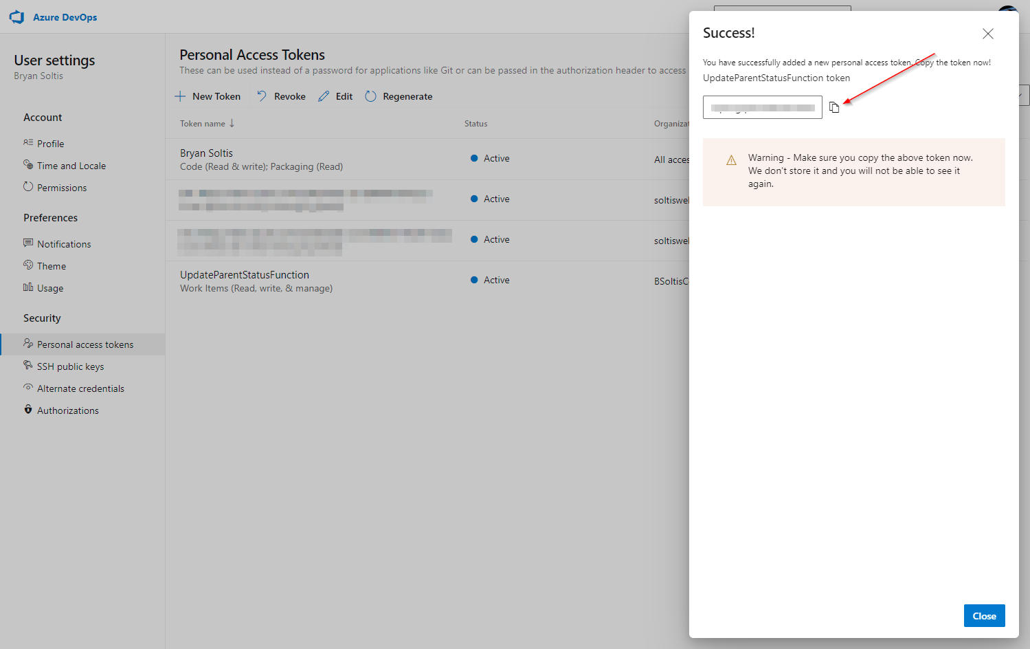 To access Azure DevOps from another system. I need to generate a PAT. This token will be used to validate my integration with Azure DevOps and should be treated as very sensitive information. In my Azure DevOps User Settings, I create a new Personal Access Token. I set an appropriate expiration date and give Read, Write, & Manage permissions to Work Items.
