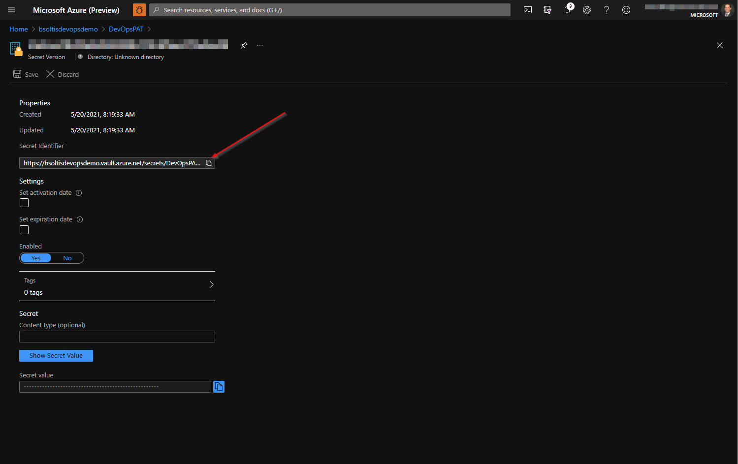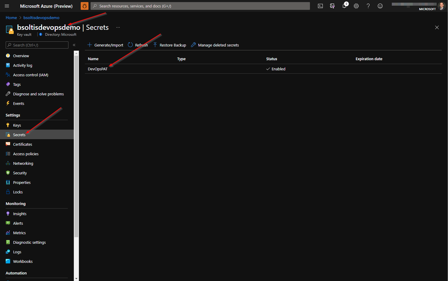 In my Azure Key Vault, I create a secret for the Azure DevOps PAT.