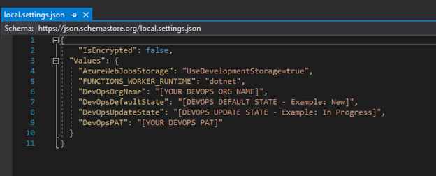 - DevOpsUpdateState: “[Your Azure DevOps state for work items to be updated to. Typically this value is “In Progress”]