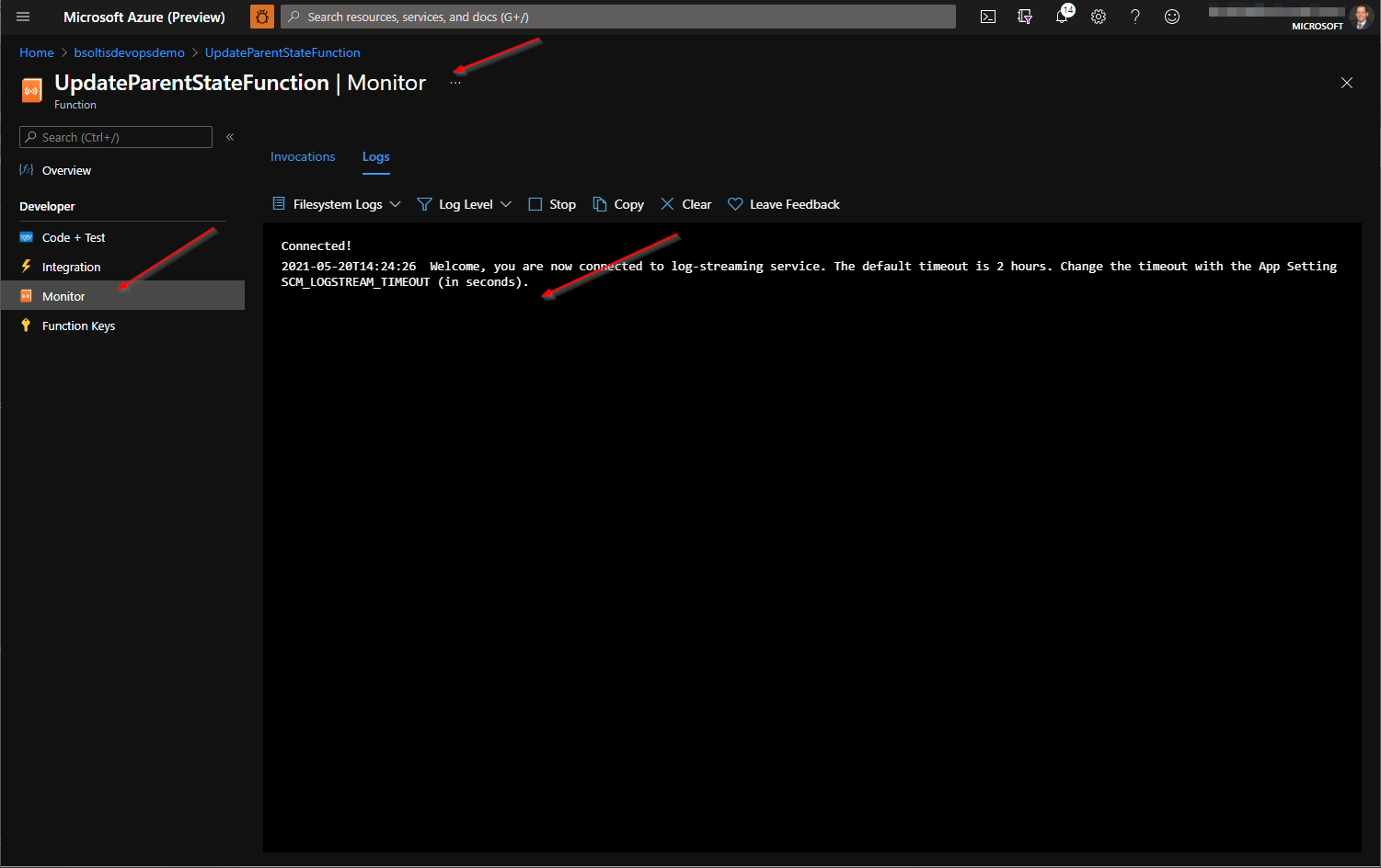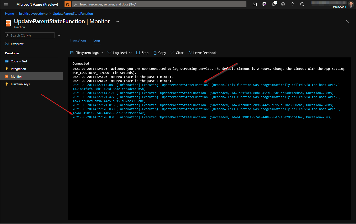 I open the Azure Function Log (Azure Function>Functions>[Function Name]>Monitor>Logs). Live streaming messages will be displayed here when the function executes.