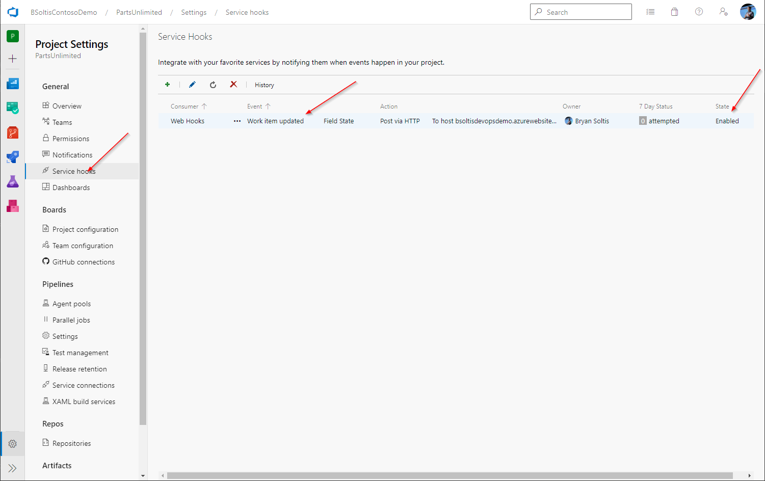 In Azure DevOps, I open the Service Hook and ensure it is enabled.