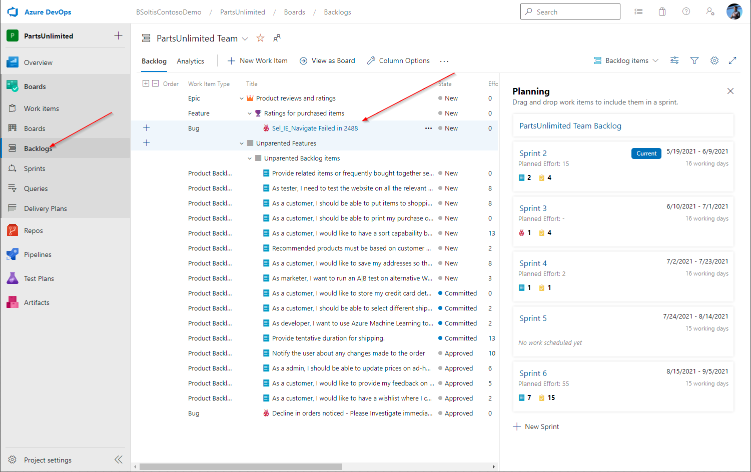 In Azure DevOps, I open my project and view a Backlog to view a hierarchy of work items. I select child work item to edit.