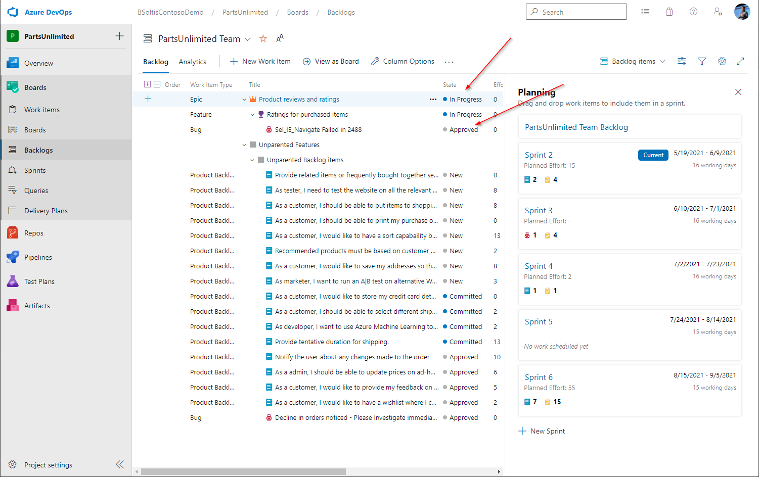 I refresh the Backlog and ensure the parent work items are properly updated to the DevOpsUpdateState in my configuration (In Progress).