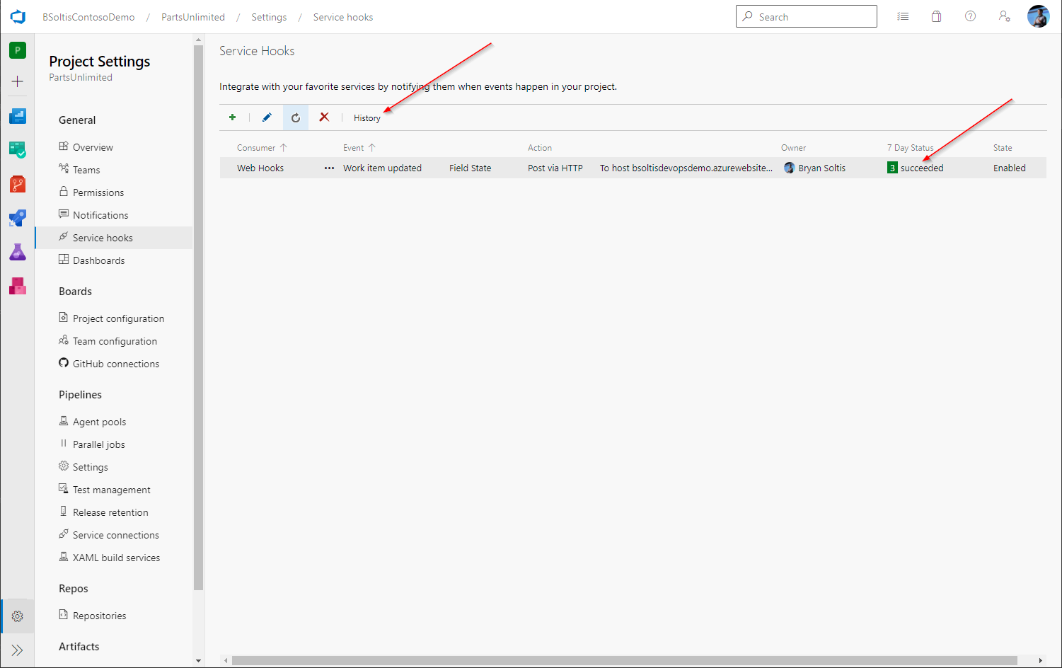 I click the History link to view details on each service hook execution. This can be especially helpful in determining what the service hook request contains and the response Azure DevOps receives from the Azure Function.