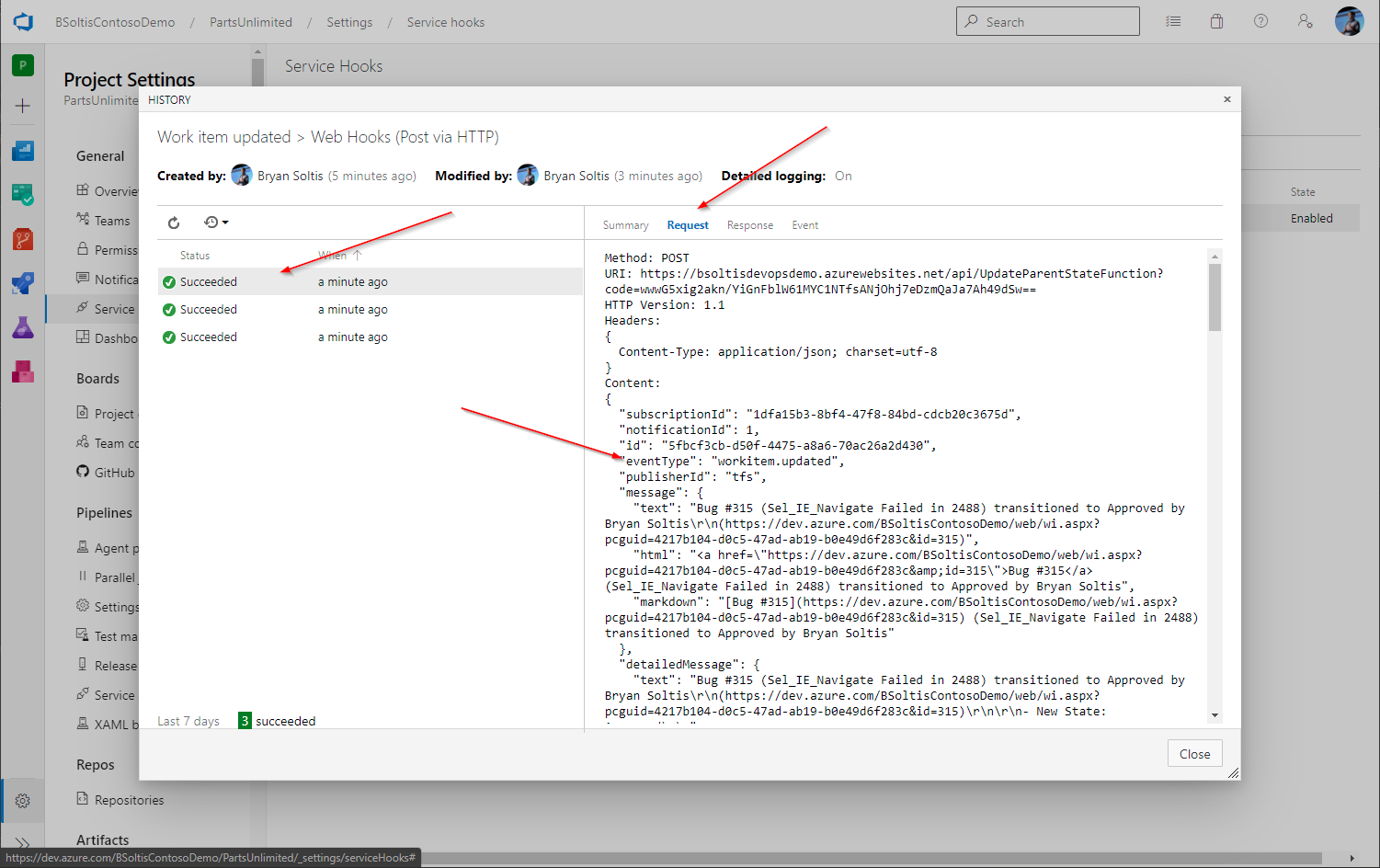 Lastly, in the Azure DevOps Service Hook page, I confirm the service hook executed successfully.
