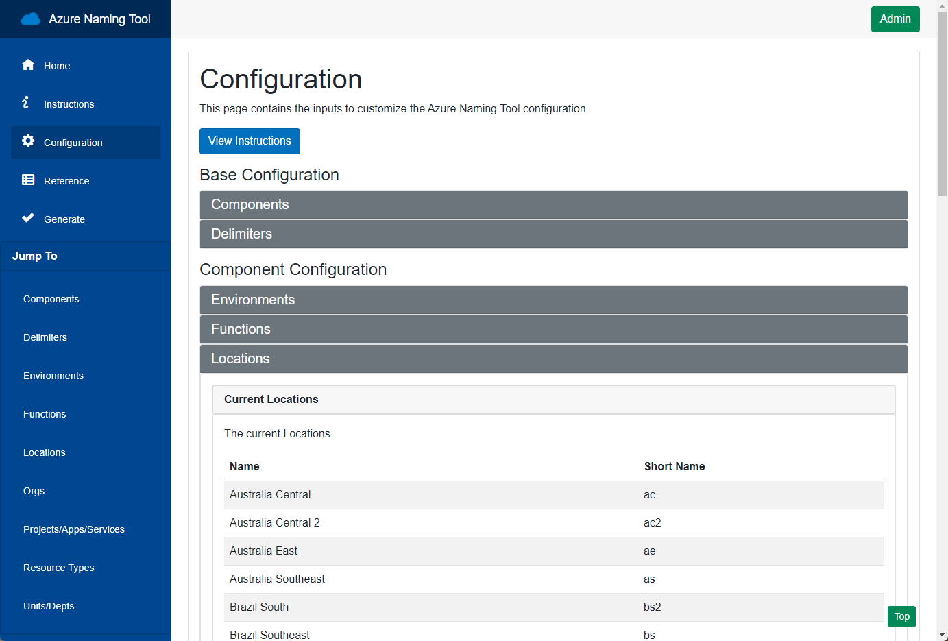 When the tool is first installed (either as a stand-alone application or a container image), an administrator will set the password. After, the administrator will be able to define the naming convention users will use to generate names. This configuration includes selecting the desired components, options within those components, and delimiter value. The selected options will be used when a resource type name is generated. This configuration is stored within JSON files within the site architecture. The Azure Naming Tool keeps a record of all configuration changes and provides the ability to backup & restore component configuration.