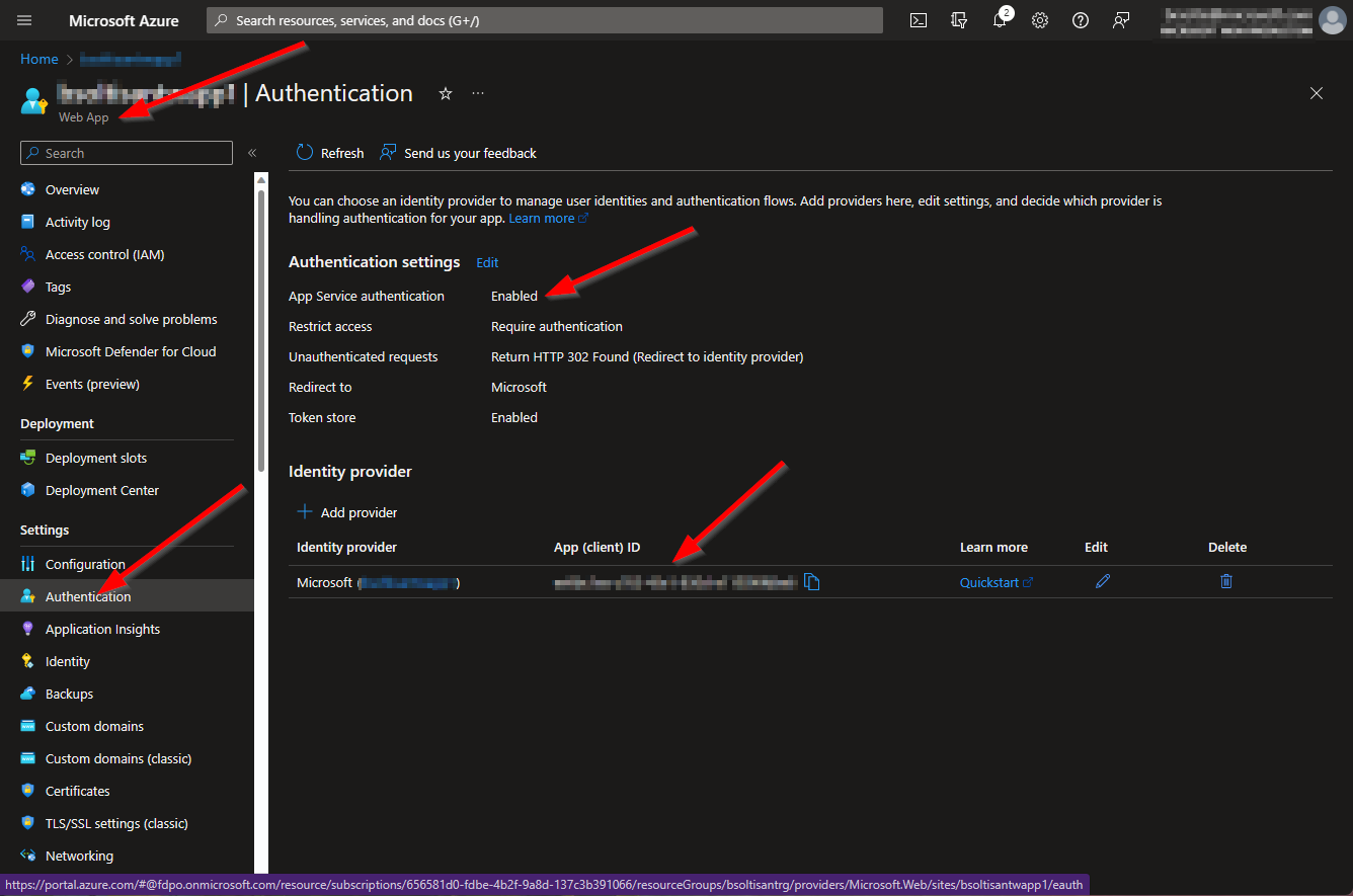 - Authentication using Azure AD on the App Service (Note the App (client) ID value)
