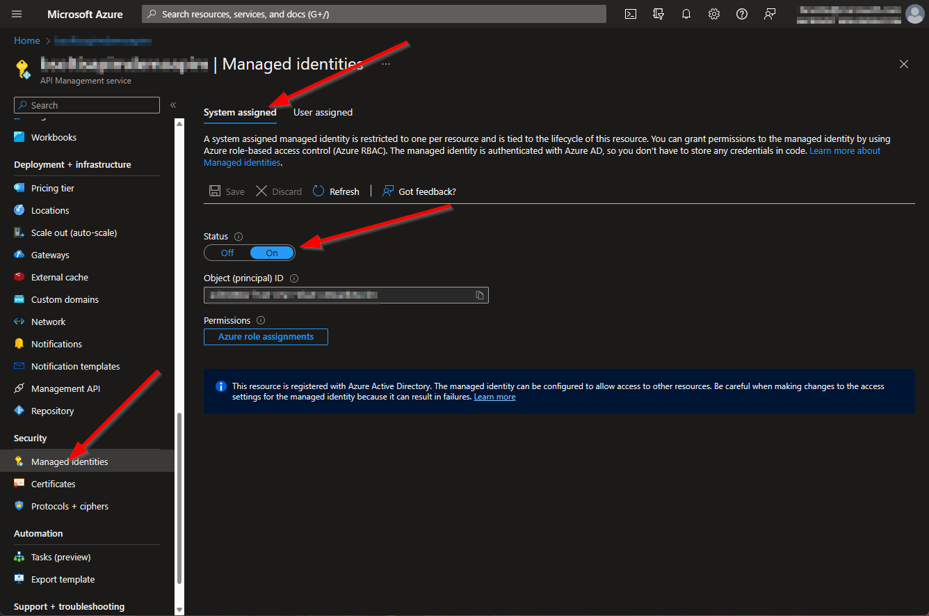 The first step of the process was to create a Managed Identity for the Azure APIM service. Managed Identities are the preferred way to authenticate an Azure resource to other Azure services. Azure will keep the credentials up to date, and you can easily set permissions to allow Service X to do/not do anything you like in Service Y.