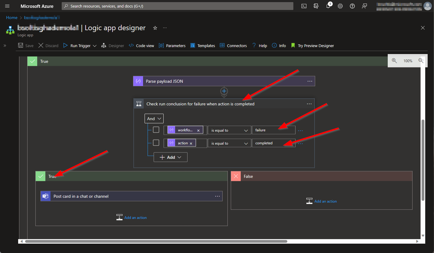 Here is a basic outline of what I’d like to implement. I want to run a GitHub Action and track the progress with Azure Logic Apps. If the Action fails, I want to push a notification to Microsoft Teams.