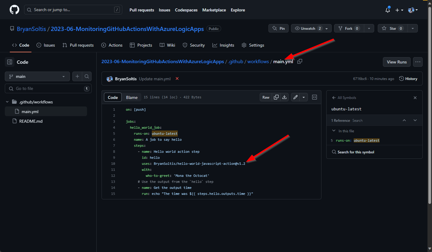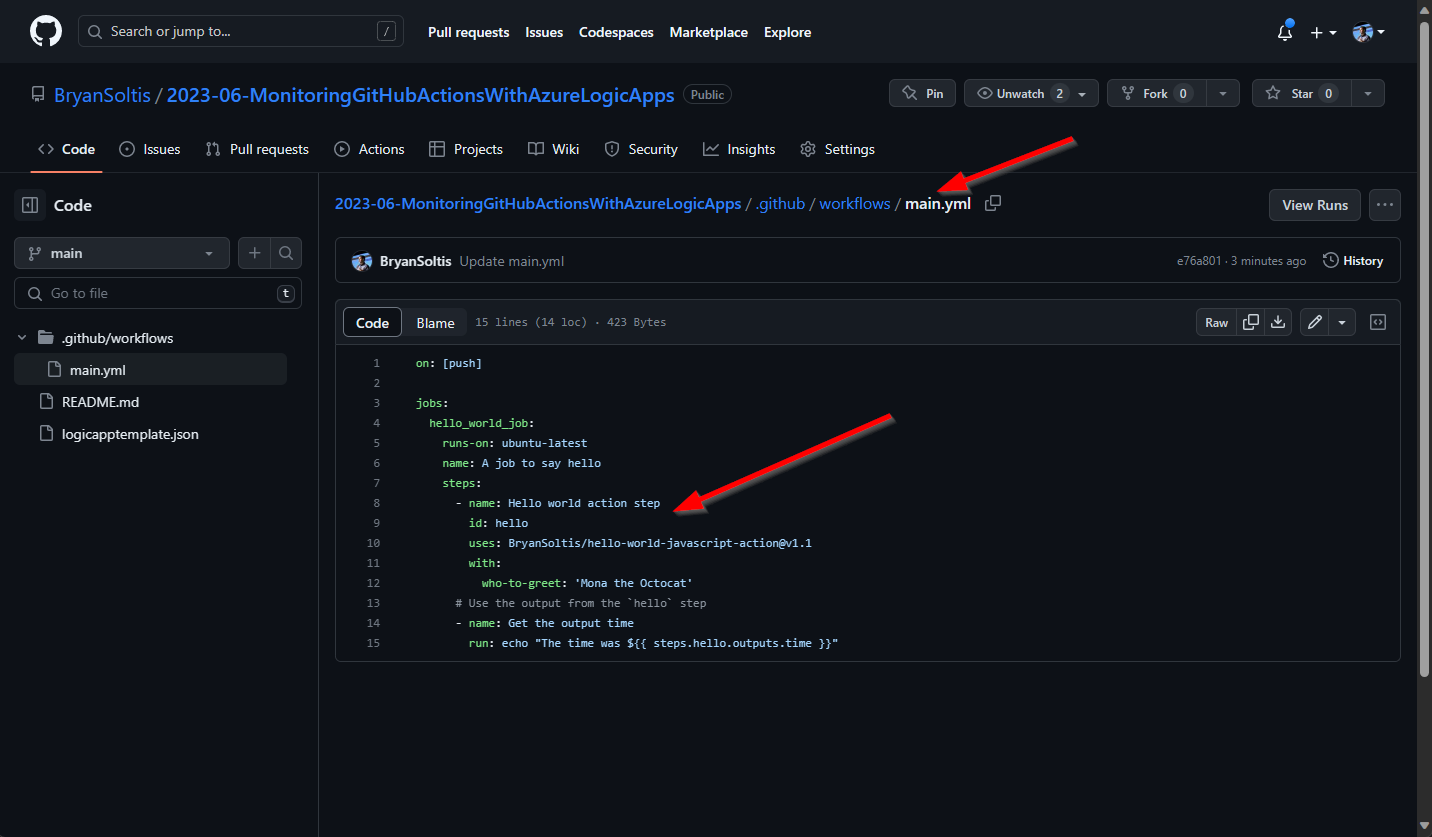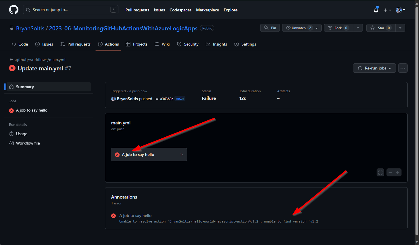 With all the pieces in place, I’m ready to test. In my GitHub Action, I edit the workflow file to ensure a failure. In my demo, I’m changing the Hello world action step to a version that doesn’t exist.