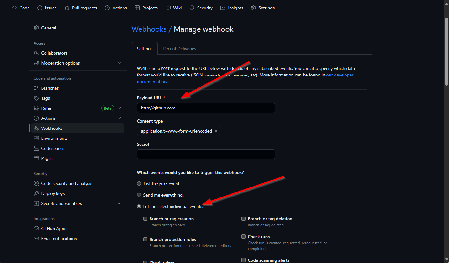For the Which events would you like to trigger this webhook I select the Let me select individual events option.