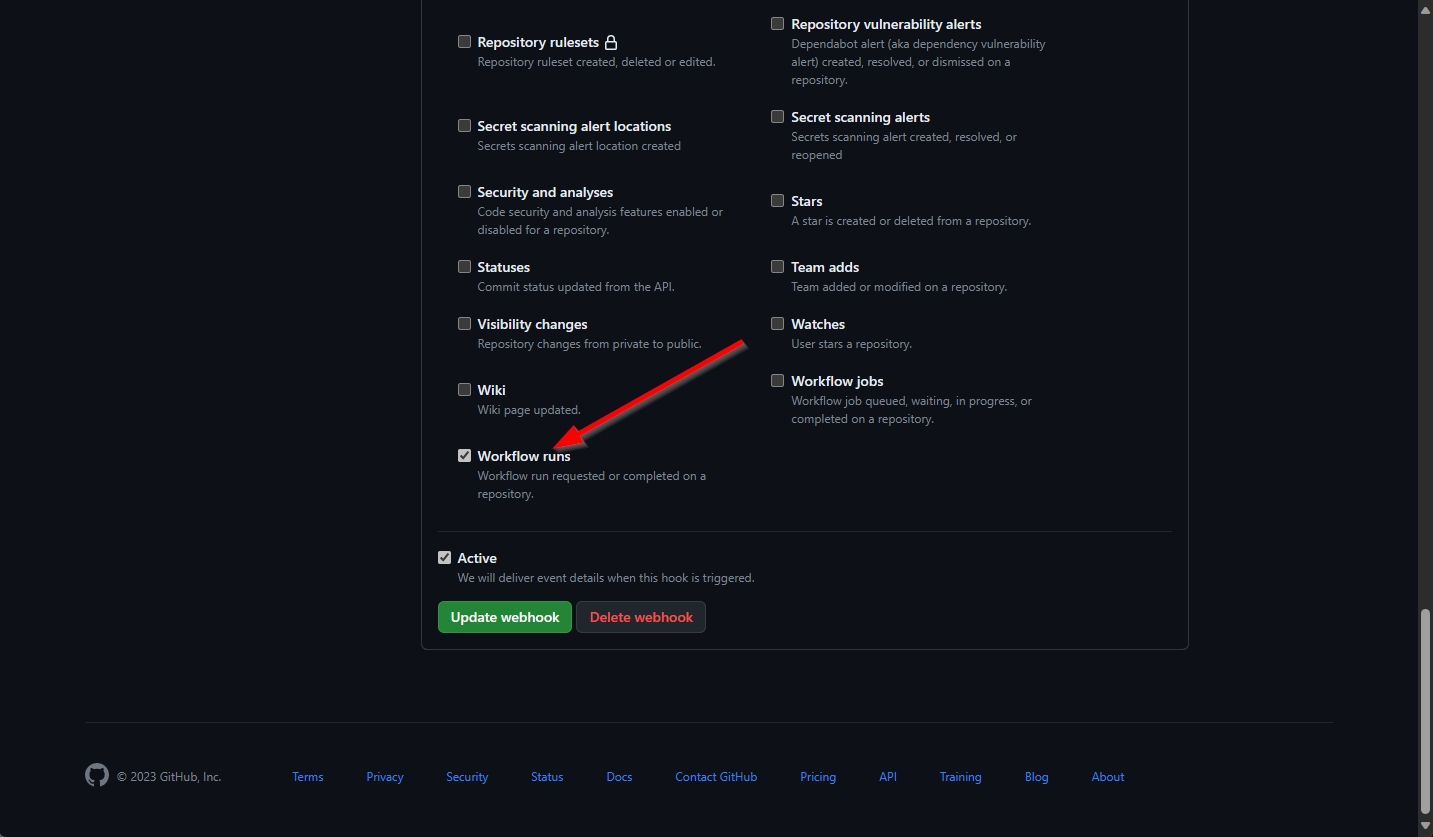 With the Action created, I am ready to create my webhook. GitHub Webhooks can be created for all sorts of events, so be sure to review the options and select the events for your needs. In my case, I only want to track when a workflow is run/completed.