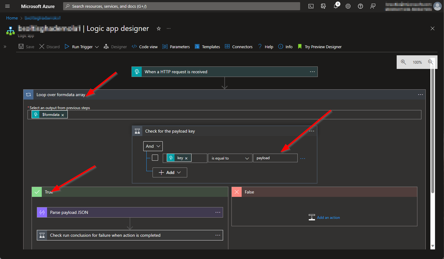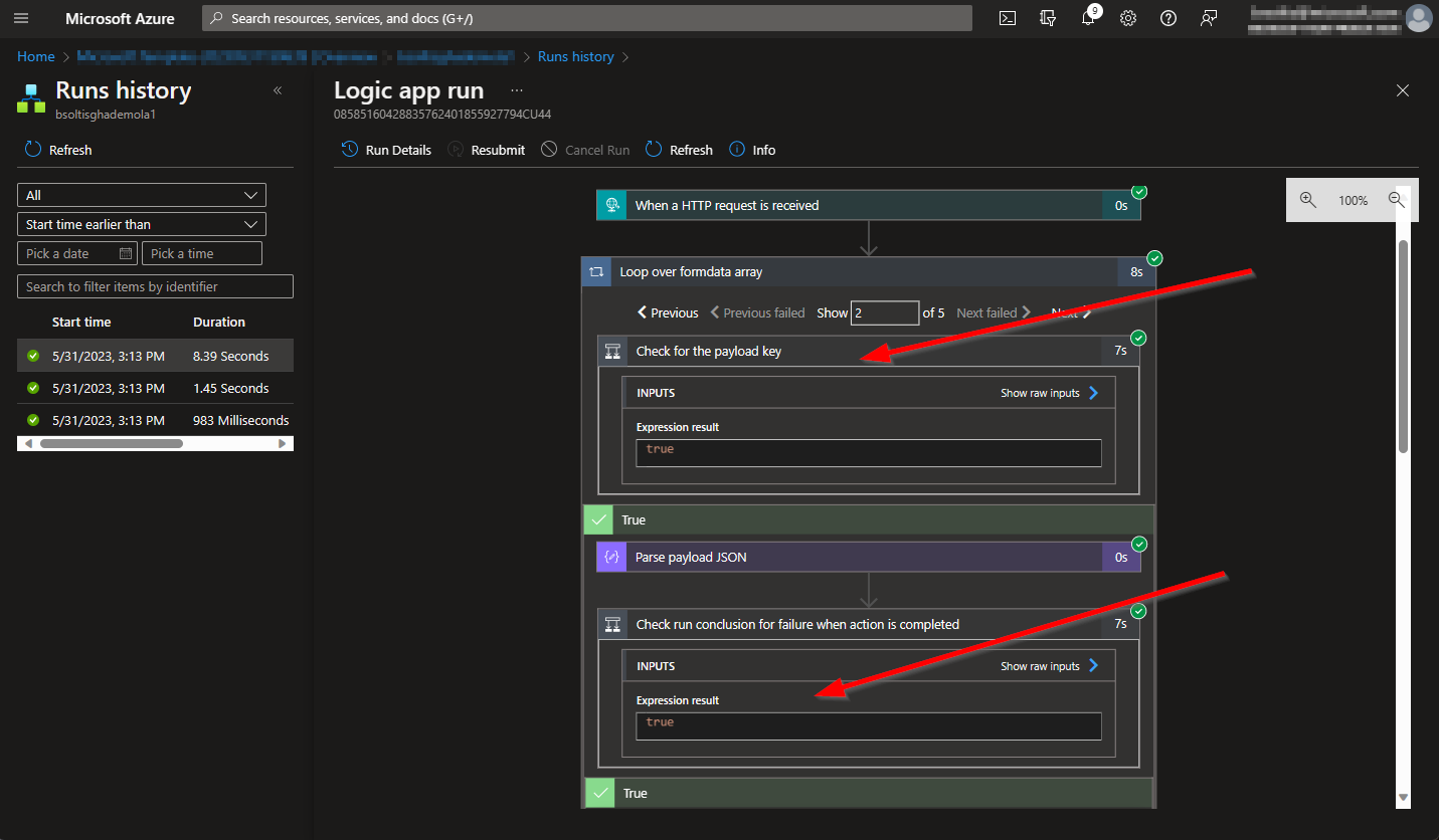 In the Logic App, I see the executions. GitHub will post multiple webhook messages for a workflow run, so it’s normal to see multiple Logic App runs.