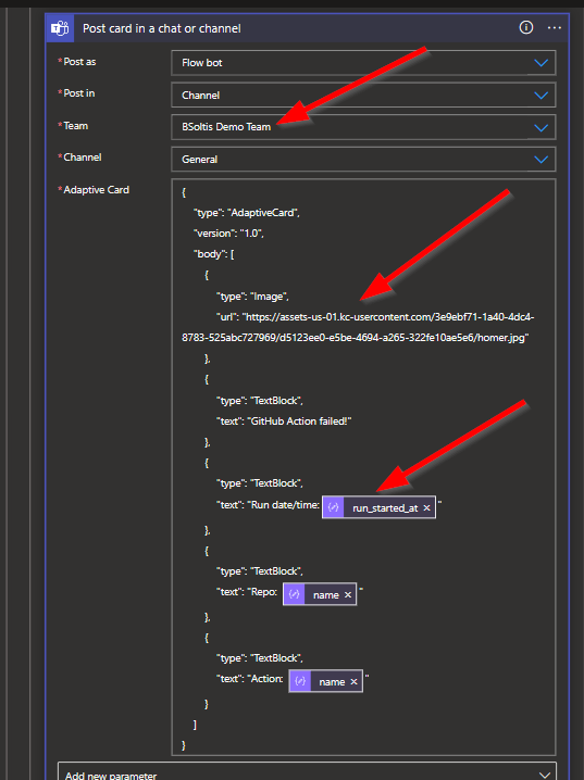 When posting to Teams, there are a lot of options for formatting the data. You can post a simple message or leverage cards to format the data and even allow responses. For demo, I’m using an adaptive card with an image and some text. I use the dynamic values from the Parse JSON step to add contextual details.