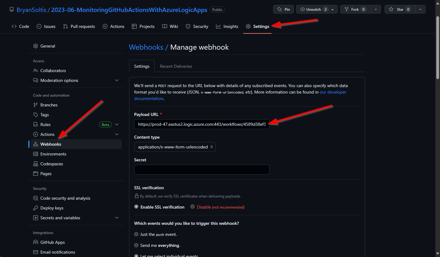 For the Payload URL, I will fill any value. When the Azure Logic App is created, I will update the Payload URL to the Azure Logic App URL.