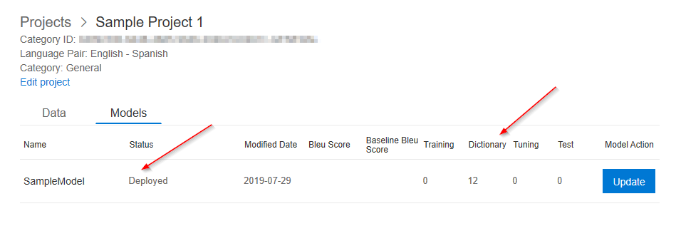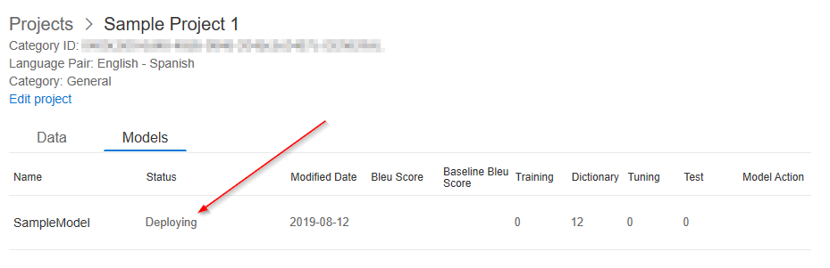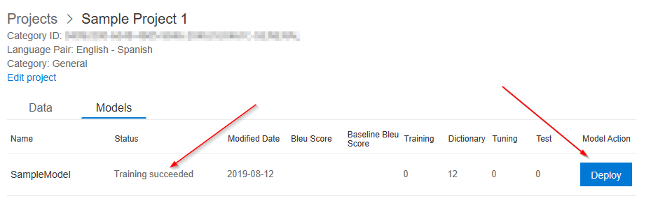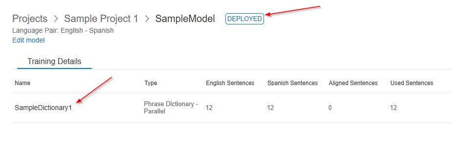 When the training is complete, the model will be ready for deployment. You will also see the number of dictionary entries the service found in the files. If I uploaded full documents of text, the UI would display the Bleu score and number of training. tuning, and testing entries.