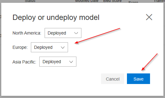 On the Deploy or undeploy model UI, I select to deploy the model to all regions. This configuration tells the service what region to deploy the model to. This will correlate to the region specified in the API call (shown below). For ease of use, I chose all regions.