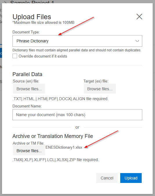 In the Upload files UI, I select the Phrase Dictionary for the Document Type. I then upload my Excel file in the Archive or Translation Memory File section.
