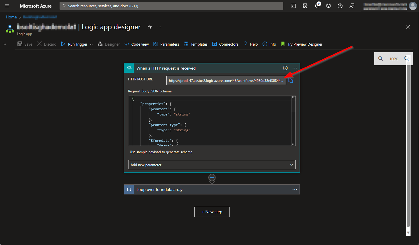 With the Azure Logic App created, I need to update my GitHub Payload URL. In my Logic App, I get the URL.